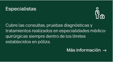 Cubre las consultas, pruebas diagnósticas y tratamientos de las especialidades médico-quirúrgicas indicadas en la póliza.